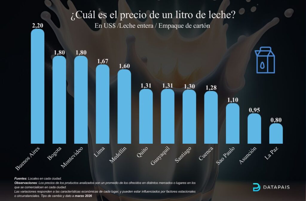 El precio de un litro de leche, un producto básico de la canasta familiar, es mucho más que un dato cotidiano: funciona como un indicador sensible de las dinámicas económicas, logísticas y sociales de cada ciudad. Las diferencias observadas entre urbes sudamericanas reflejan no solo estructuras de costos, sino también niveles de ingreso, eficiencia productiva, políticas públicas y condiciones de mercado.
